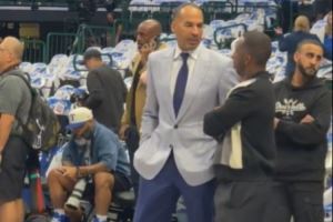 独行侠总经理尼克-哈里森和著名经纪人富保罗场边畅聊